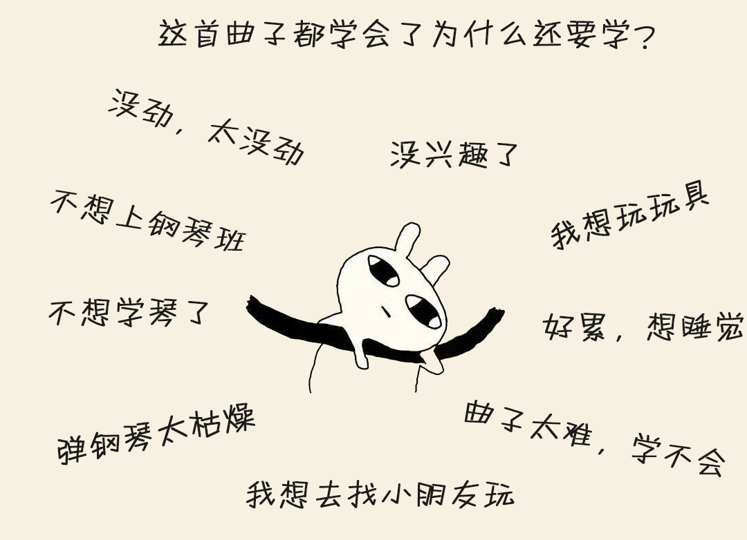 当难度增加,孩子的畏难情绪也开始叠加,突然觉得自己怎么也弹不好,逐渐从不肯练到抵触排斥。