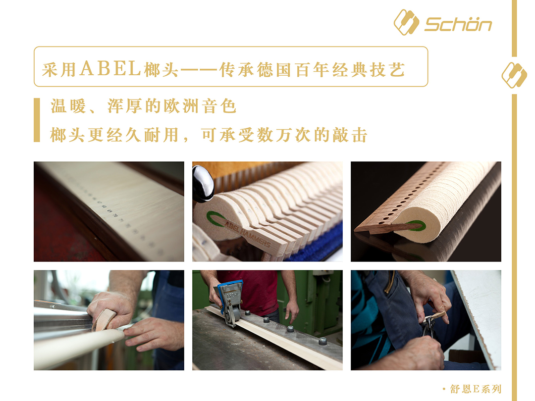 ABEL弦锤公司在全世界有众多的客户和合作商。舒恩钢琴出于对品质的追求,同样地每年都会从ABEL弦锤公司进口大量的顶级榔头,作为舒恩E系列的核心配件之一。